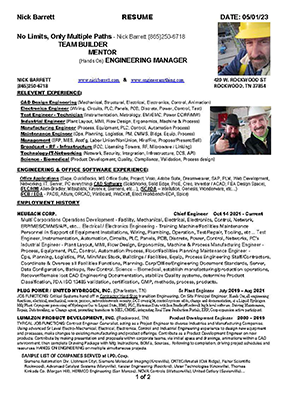 ENGINEERING GENERALIST - Transistioning to advanced "Electro-Mechanical Engineer" through extensive, hands on experience, over "tens of thousands of hours" of inventive & innovative "machine design & product development engineering", manufacturing support & "management of product, process & people". Over time, this has given me a very broad "perspective & understanding" of product development, manufacturing, engineering & technology driven products. My unique background in so many industries & technologies create an Engineering Generalist perspective & knowlege base that allows me to transition from one industry & product to another, & then another... With the advanced global skills of an Engineering Generalist I can quickly theorize, interpolate, extrapolate, & grasp virtually any technology based foundation behind a product or business, & then "jump in" to participate, contribute, or lead within any team environment.