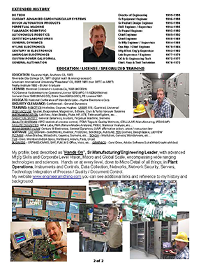 ELECTRICAL / MECHANICAL ENGINEER - My experience now spanning decades and including the transition period from vacuum tubes to transistors, discrete semiconductors to integrated circuits to VLSI, SMT microelectronics, hybrids, etc... Becoming an engineer through non-conventional "on & off the Job Training", hands on experience, self education & starting my own electronics businesses, then by degree's & other OJT training programs by leaders in industry. Hired as a "Sr Electrical Engineer & Team Manager" in 1984 at "General Dynamics", I began a transition phase in my career to leading edge "Mechanical Engineering" through extensive vendor training programs, intimate involvement in microelectronics manufacturing, robotic & automated manufacturing technologies.